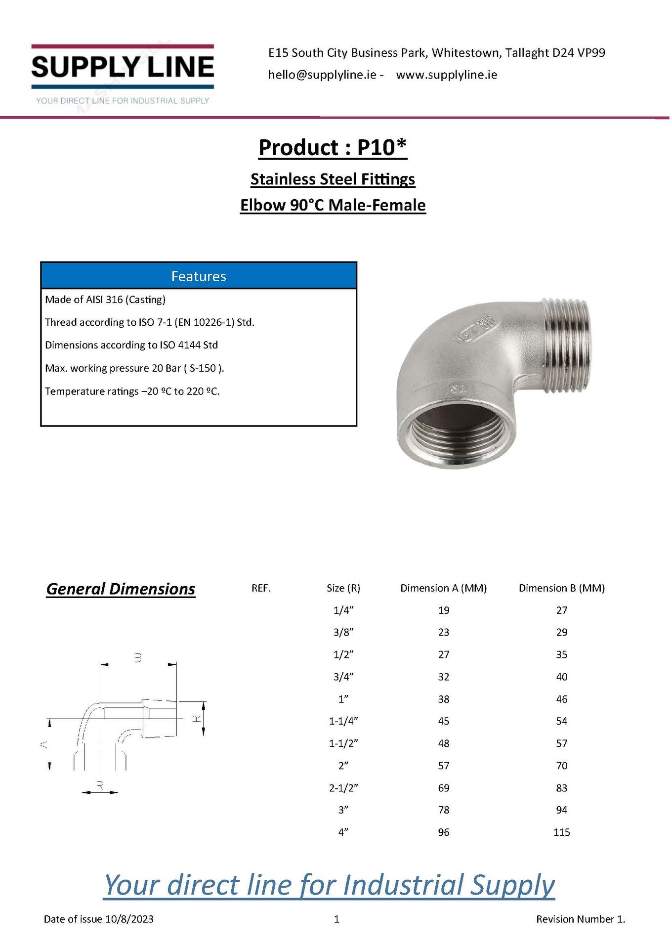 Made of AISI 316 (Casting) Thread according to ISO 7-1 (EN 10226-1) Std. Dimensions according to ISO 4144 Std Max. working pressure 20 Bar ( S-150 ). Temperature ratings –20 ºC to 220 ºC.